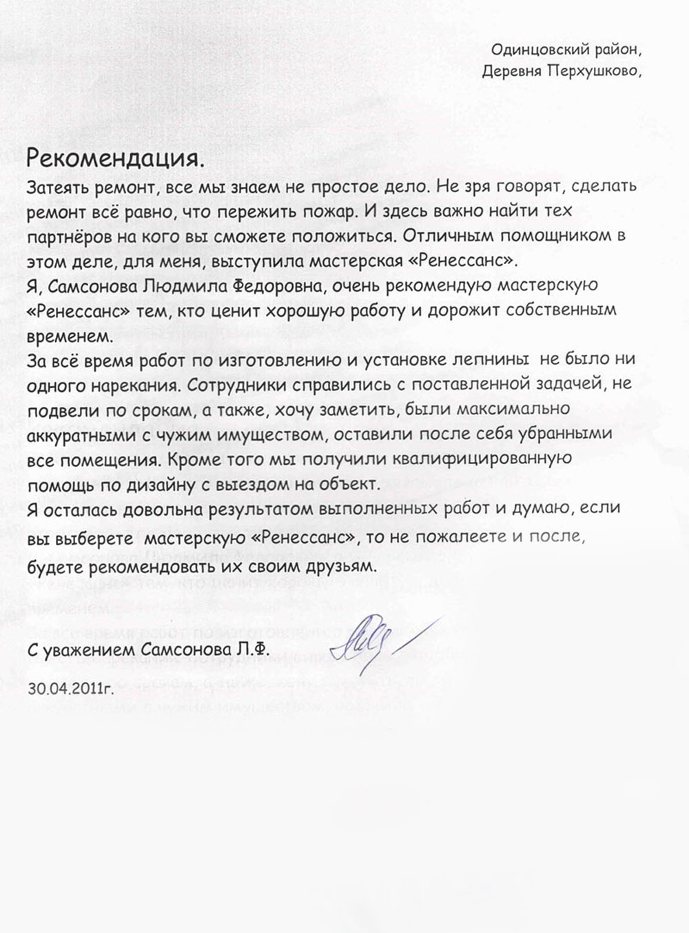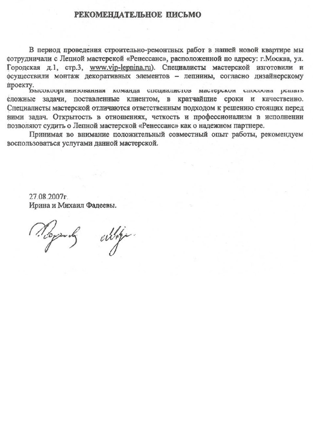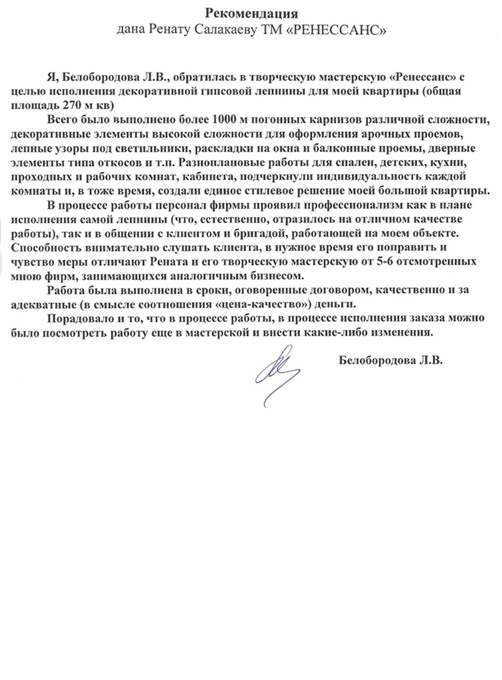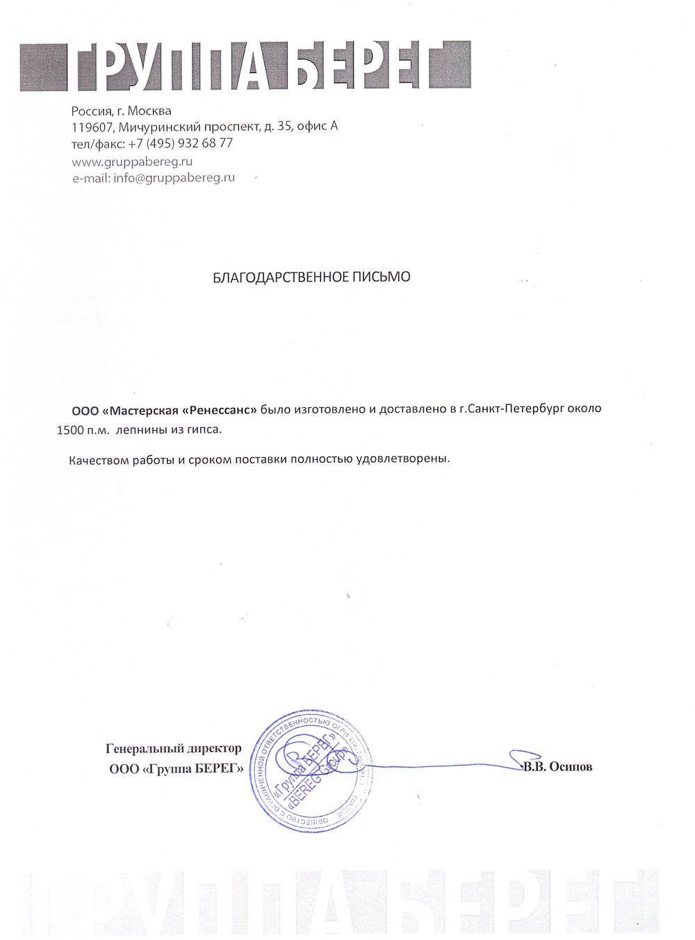 Самый честный показатель нашей работы — это довольные клиенты и их дома, которые с каждым годом становятся только красивее. С 2011 года мы производим фасадный декор из полимербетона, и за это время к нам не поступало ни одного гарантийного случая. Это лучшее доказательство долговечности материала и качества нашей работы. Ниже — официальные благодарности от заказчиков, архитекторов и строительных компаний. А фото реализованных проектов вы можете увидеть в нашем портфолио.